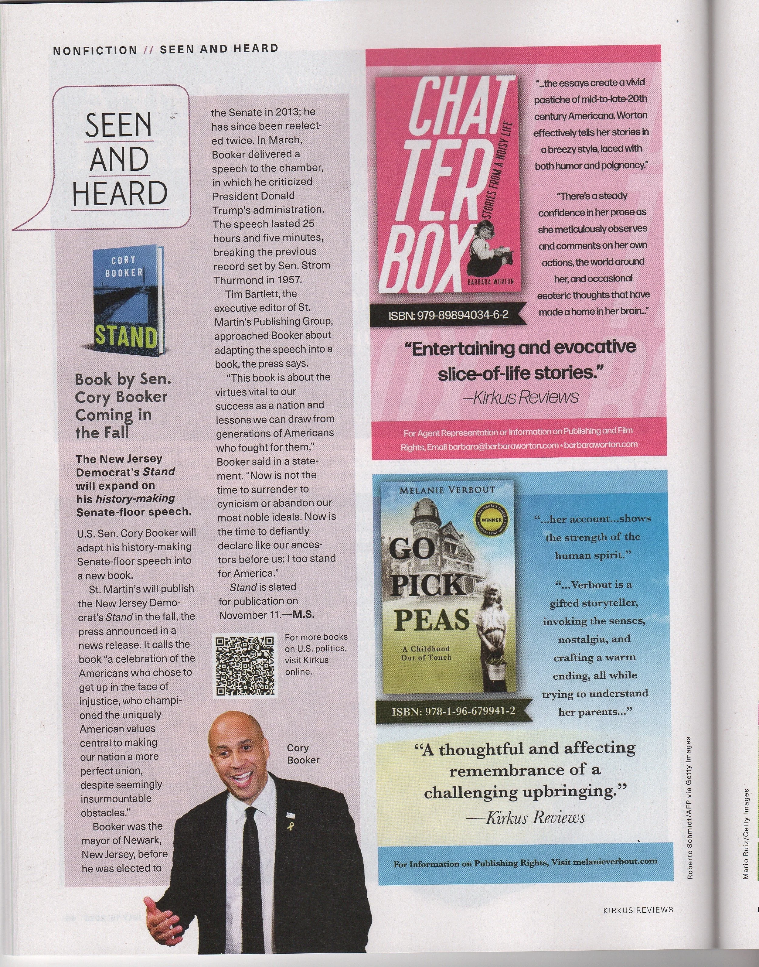 Okay, I’ve been blabbering about Kirkus Reviews a lot, but I promise I’ll give it a rest after this newsletter, so please bear with me. When Chatterbox earned a review in the print edition of Kirkus Reviews, I was offered a chance to buy some ad space. I wasn’t sure about it. Thought through the benefits and the downsides and mentioned to my friend Tony Amatullo (another July baby) that I wasn’t sure if I should buy ads or not. He offered some sage advice, “There’s nothing better you can do than to invest in yourself.” Yeah, I thought, sounds good. So I bought a mini-ad campaign. The first ad ran in the July 15th issue. Spielberg has not called asking to option my stories for a streamer yet, but I am getting attention and the review is another great marketing tool to open more doors. (Chatterbox ads will run in the 7/15 and 8/1 online and print magazines, on the website on 7/21- 8/23 and in Kirkus Reviews’ email on 8/5!)