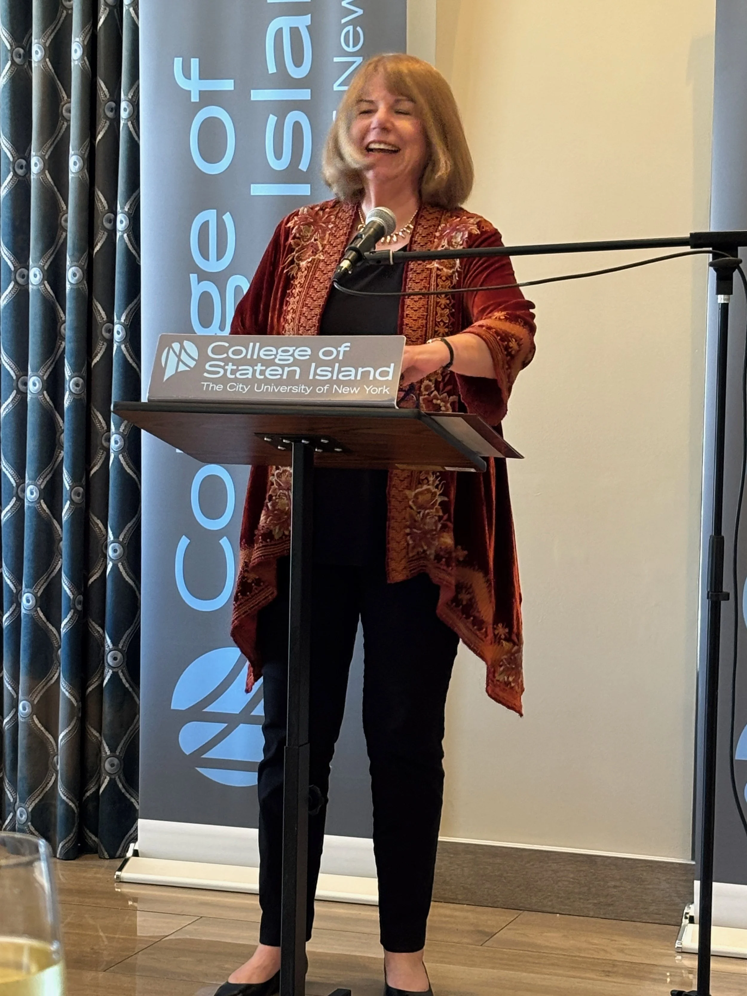 Sixty people turned up for the Friends of CSI Literary Luncheon. This picture should give you a good idea of how much fun I had speaking at the event and meeting so many wonderful people there to donate scholarships for The College of Staten Island (CSI). Let me say, I was also a nervous wreck. In the crowd on the day were Dr. Timothy Lynch, President of the College of Staten Island; Dr. Christina Tortora, Chair of the English Department; Jacqueline Lamberti, Associate Director of Alumni Relations & Annual Giving; Cheryl Adolph, Interim Executive Director for Institutional Advancement and the CSI Foundation Inc.; Carol Beraradi, President, Friends of CSI and National Overseer of the Garibaldi Meucci Museum and six students from the English Department. An extra big shout-out goes to Carol. She invited me to read from Chatterbox at the Garibaldi Meucci Museum in April and to be the speaker on October 5. I can’t thank her enough. A bunch of my dearest friends, Paula, Dee, Mark and Maggie, and of course, my hubby, the man who gets me through all these events, Geoff, were also there to cheer me on, enter the raffles (and win) and enjoy some delicious Italian food. Thank you, Osteria Santina. And thank you to my friends who couldn’t be there on the day but donated to the scholarship fund. This event was near and dear to me. CSI changed my life. There would have been no Chatterbox or a writing career if I hadn’t attended and graduated from the college.
