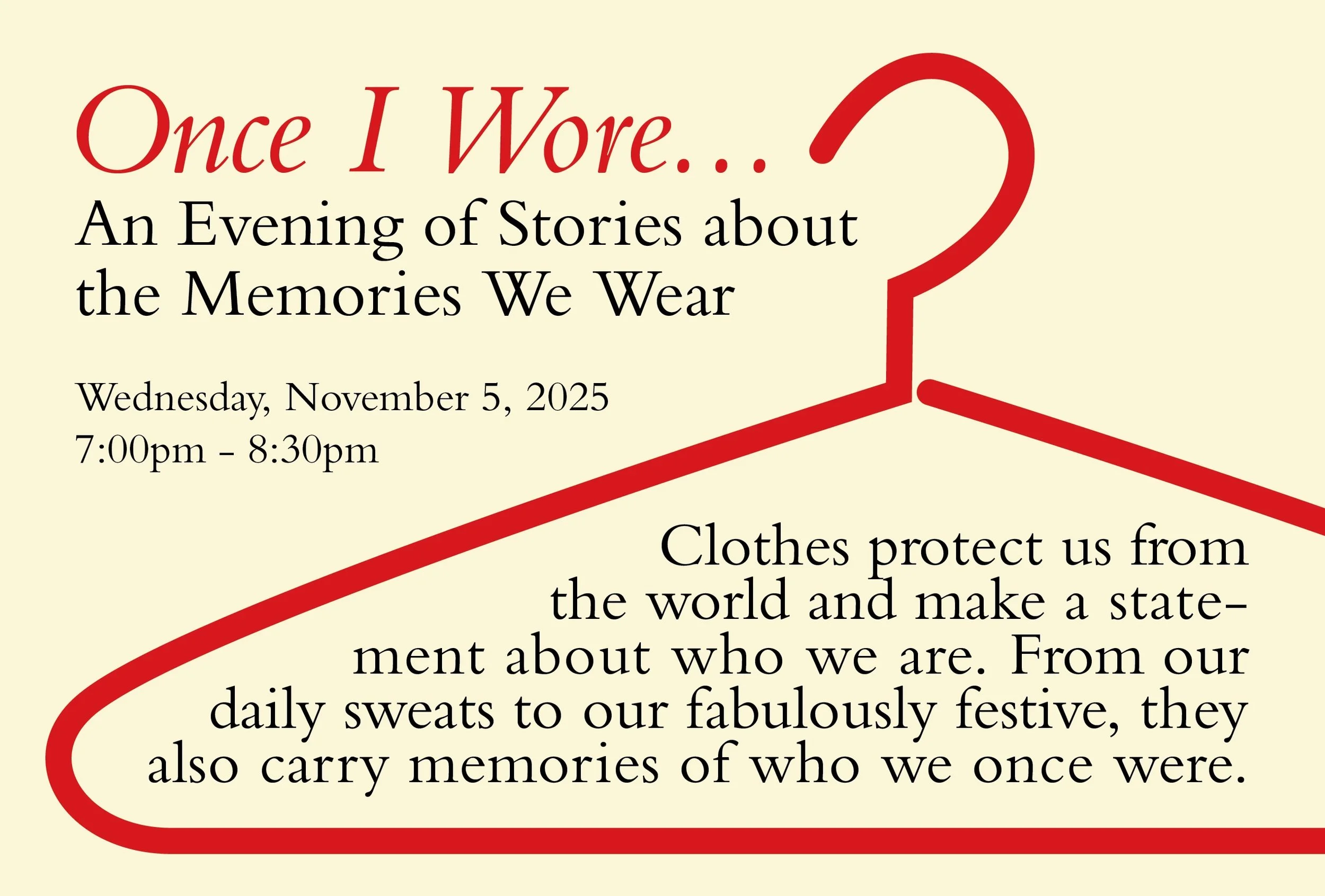 After our stories, if you’re in the room, it’s your turn! Have a “Once I Wore . . .” memory you’d like to share about a beloved article of clothing? At the event, you’ll be invited to write your idea on a piece of paper for us to pick from a hat. If we draw your name, you’ll have 4-5 minutes to wow us with your story—on stage, without notes, à la “The Moth.”